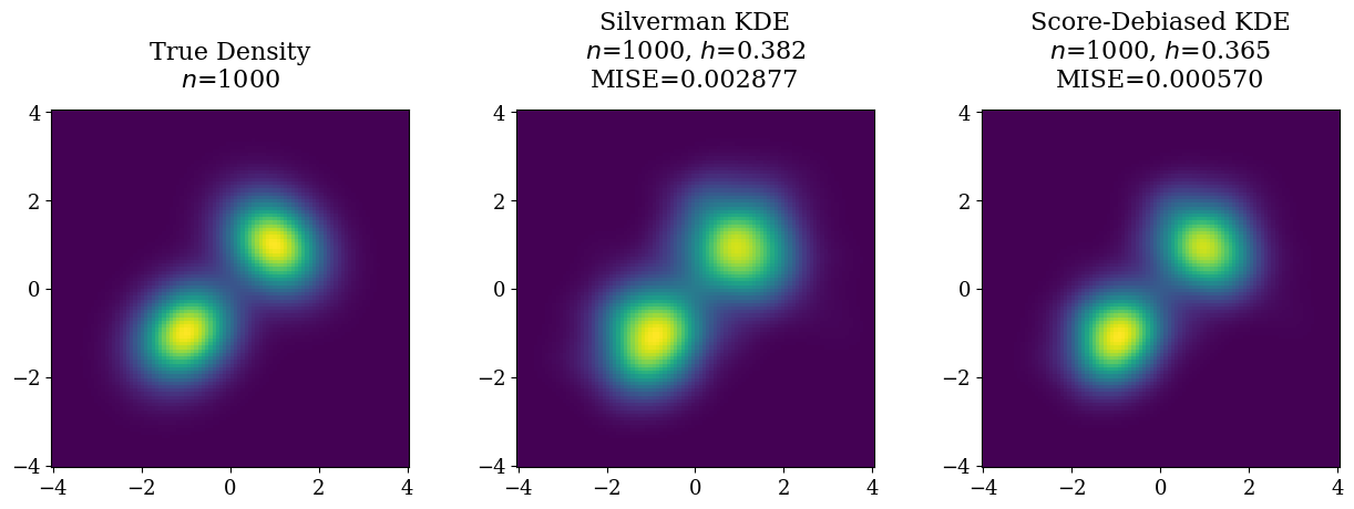 - 1D Gaussian and Laplace mixture experiments with improved MISE scaling compared to classical KDE.