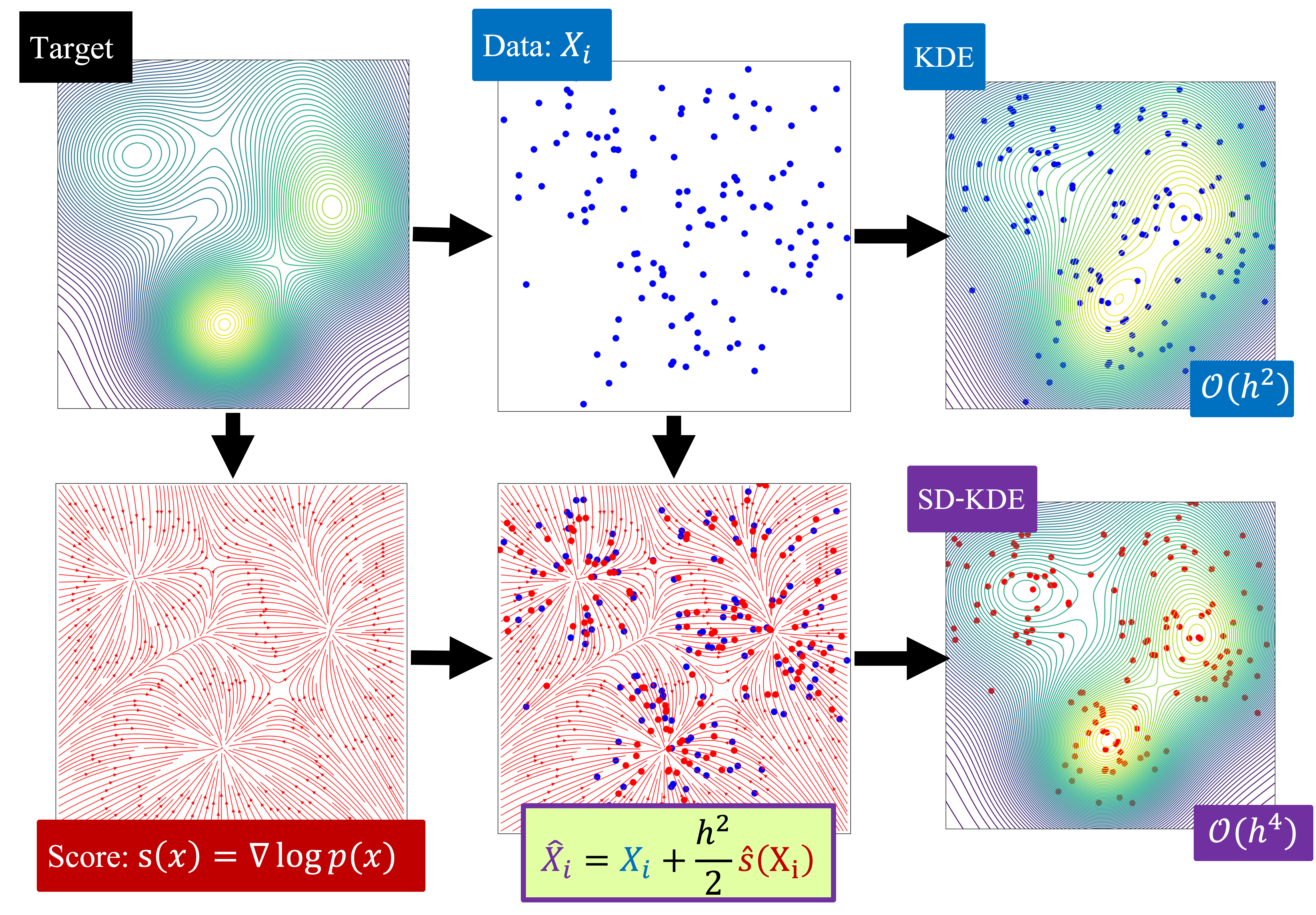 - SD-KDE shifts each sample once along an estimated score, then runs standard KDE on the shifted points.
